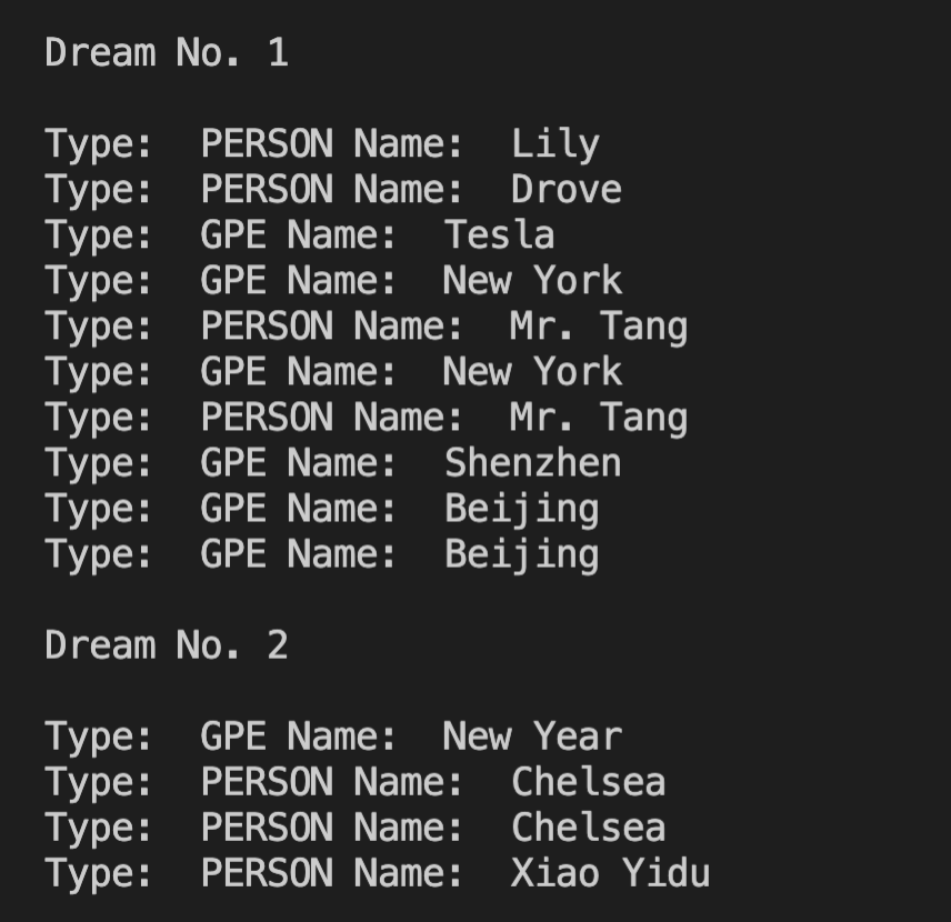 Note that we can also examine the extracted names of nltk using .label(). nltk can distinguish between person names (“PERSON”) and geo-political entities (“GPE”) like city names. Below are the extractions from two dreams: