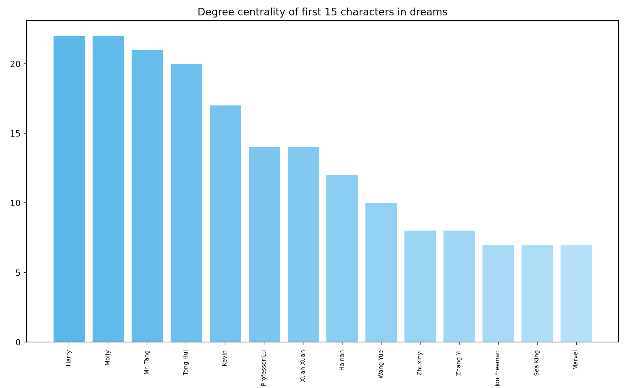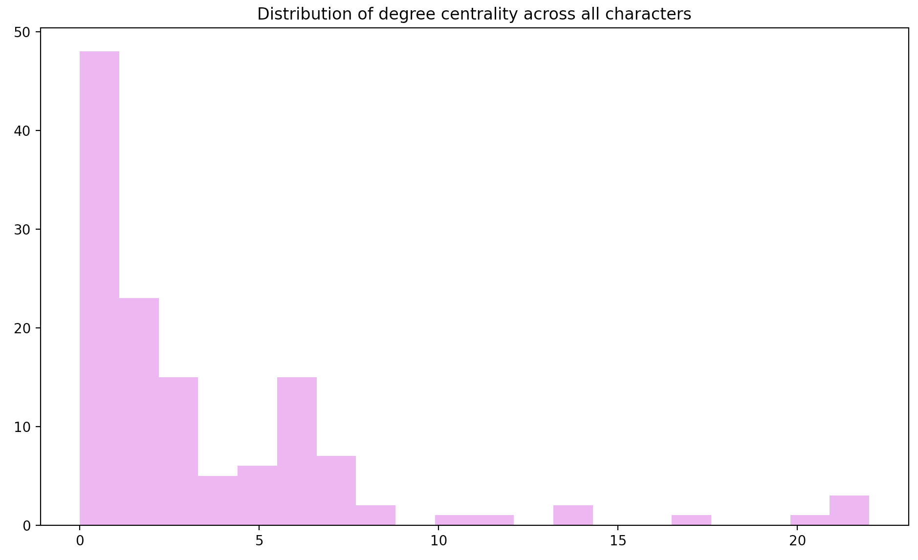 First, let’s visualize how many times each character has occured across all dreams, that is, the distribution of the degree centrality of each node. As the first figure shows, degree centrality appears to follow a power-law distribution, as in many real-life social networks.